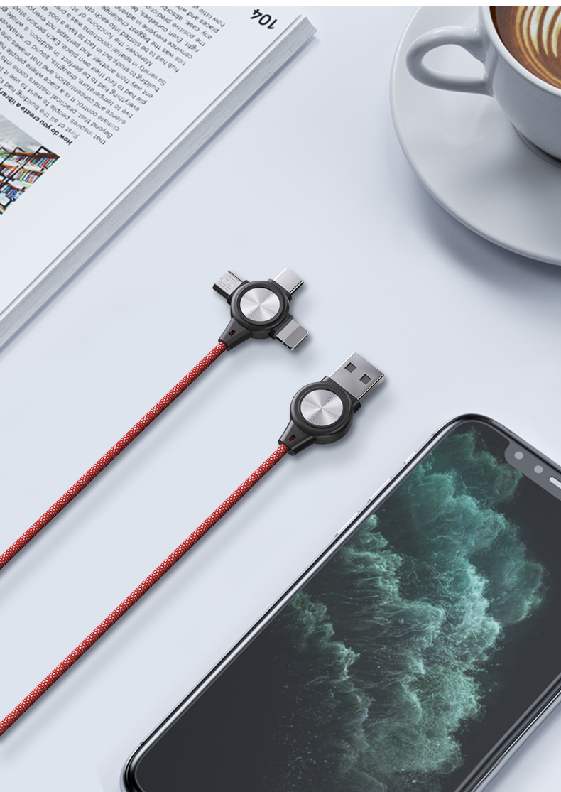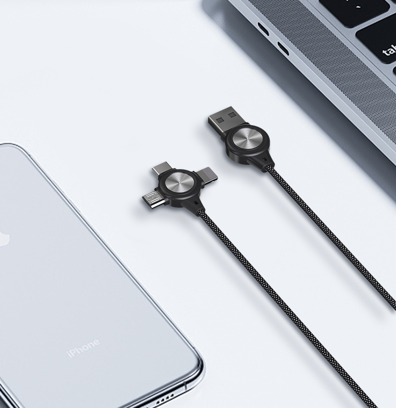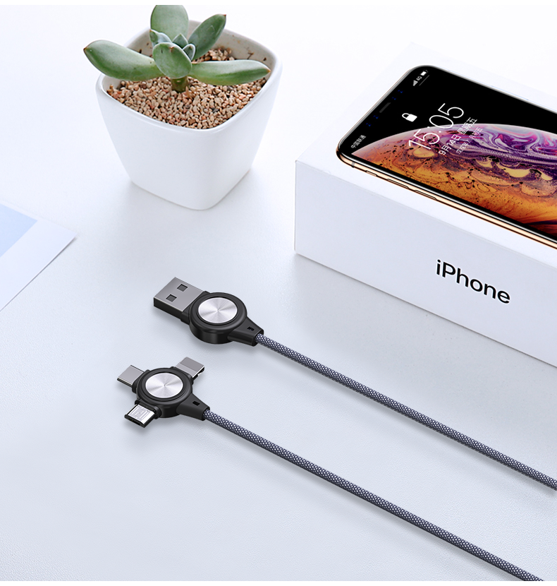Con una longitud de cable de 1 m, este producto tres en uno permite la carga simultánea de dispositivos móviles y la transmisión de datos a través de tres puertos, utilizando cables de cobre estándar nacional de 100*0,1 con una corriente de 3 A. Ofreciendo negro, gris, azul denim y rojo como opciones de color de cable exterior, está revestido en el automóvil y combina tela con un resistente acabado de aleación de aluminio.